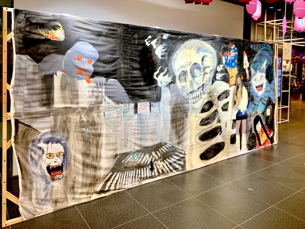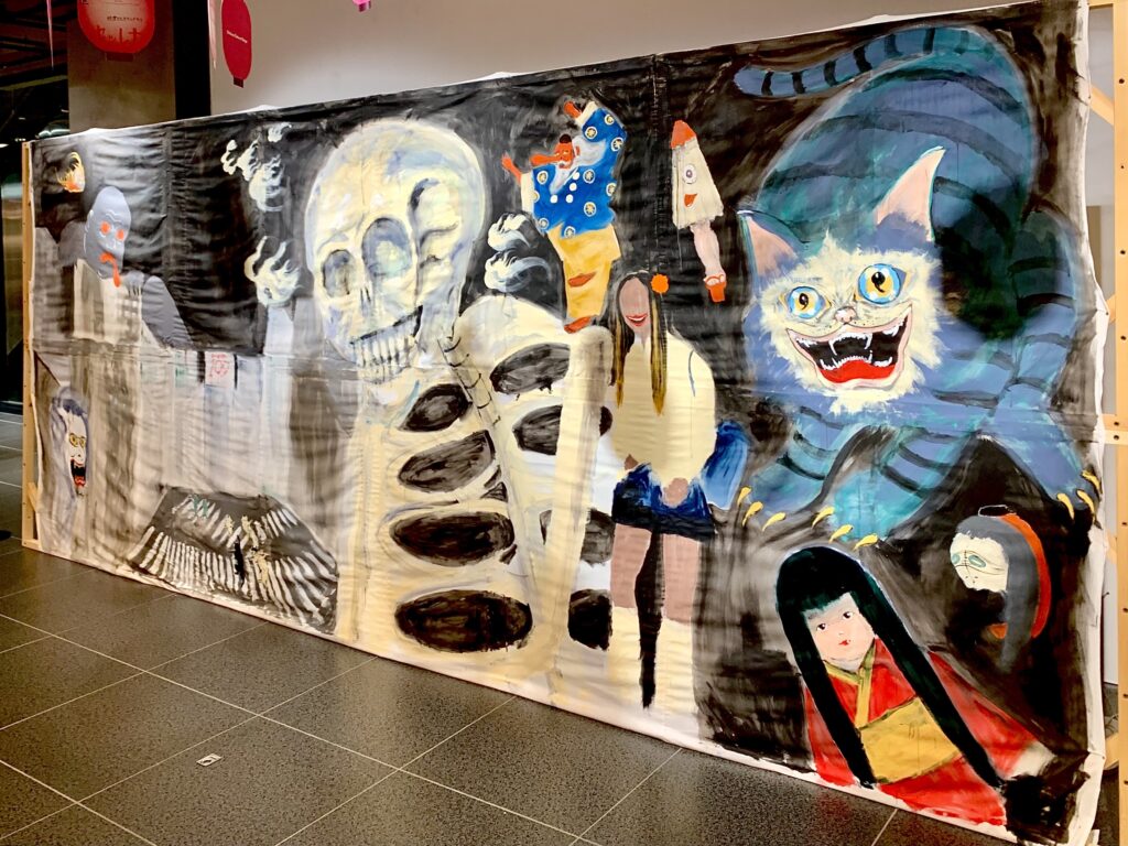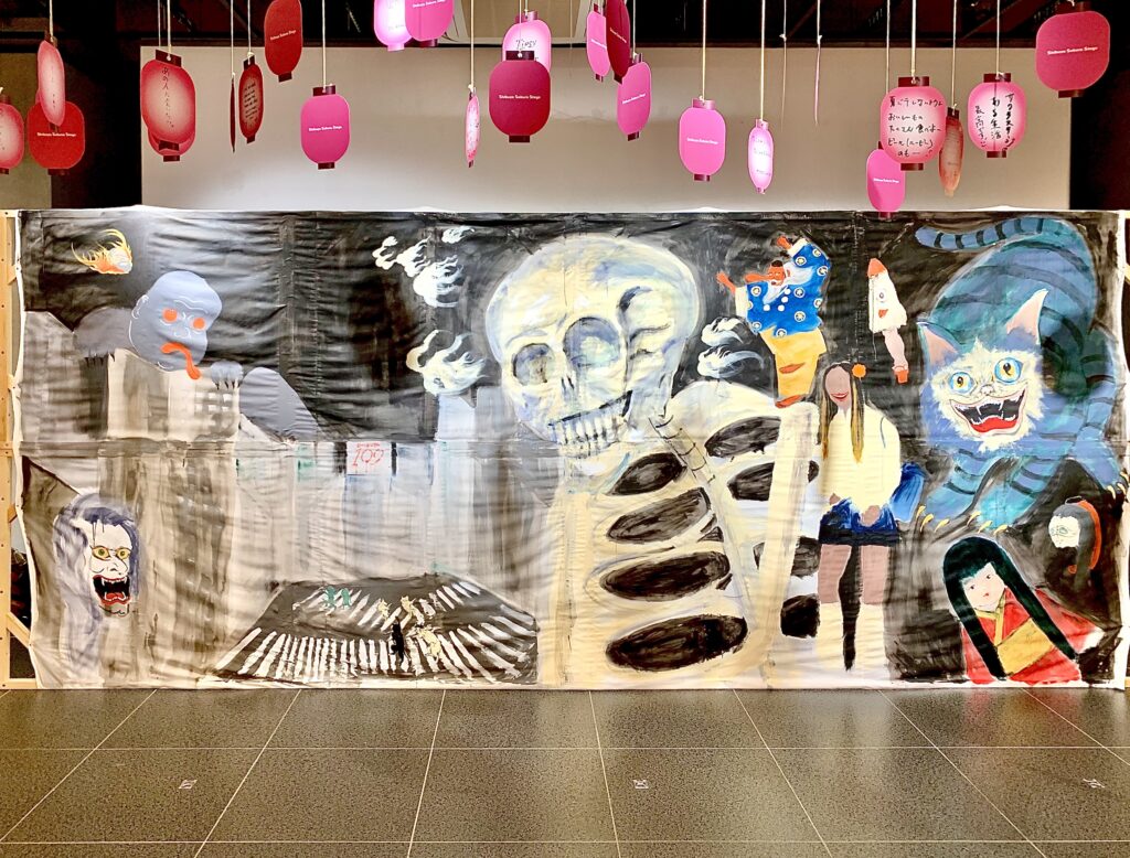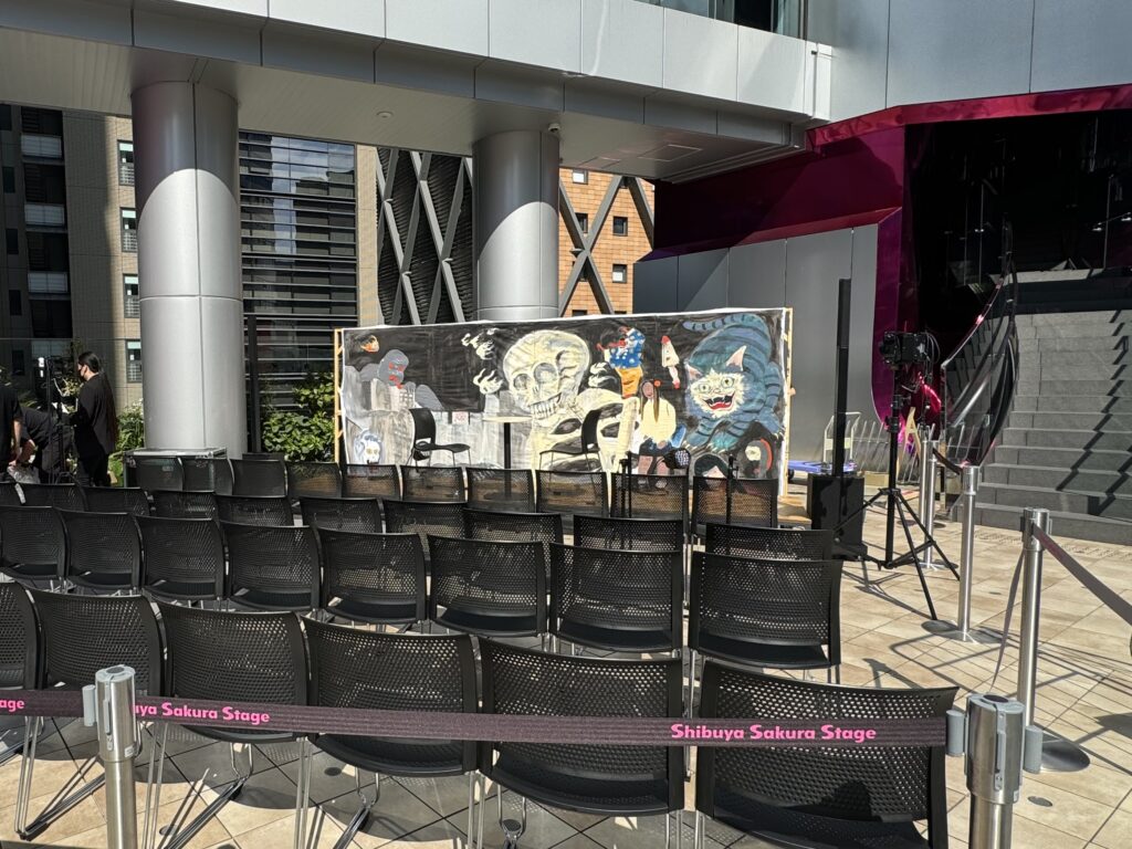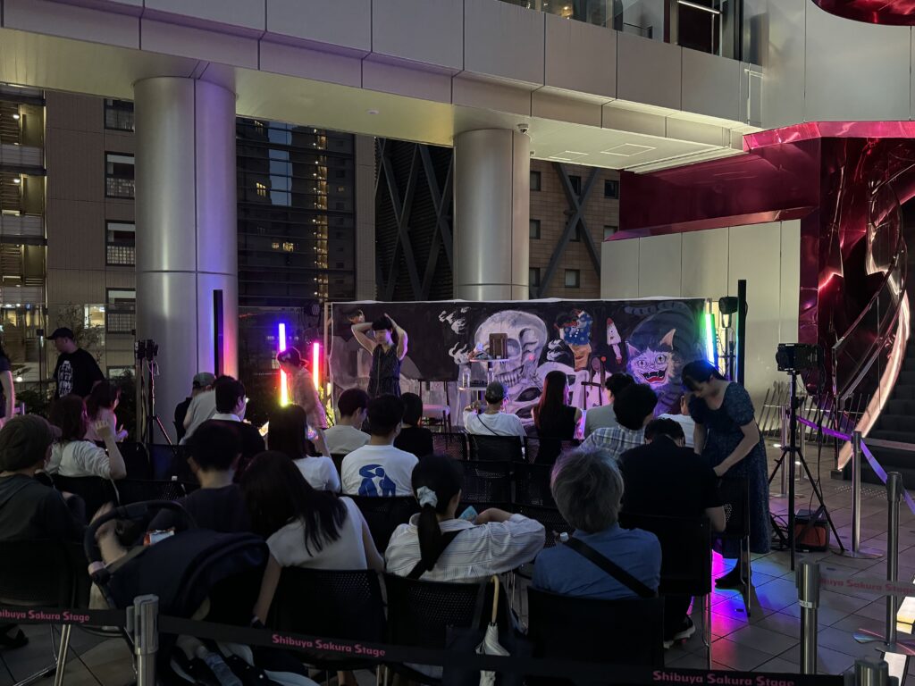 2025年、渋谷サクラステージまちびらき1周年記念のイベントとして『Shibuya Sakura Stage 1st ANNIVERSARY PARTY渋谷納涼大感謝祭』を2025年7月12日(土)〜8月3日(日)の期間に開催され、その中で「妖怪即興壁画」と題されたSHIBUYA SIDE4Fのre-searchで「渋谷の妖怪」をテーマにライブペインティングを行いました。そして描いた絵を舞台の背景に使用していただき、田中俊行さん(オカルトコレクター/怪談師)、クダマツヒロシさん(怪談作家・怪談師)による怪談イベント『冷感ナイト』も大盛況だったようです。