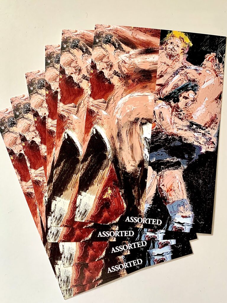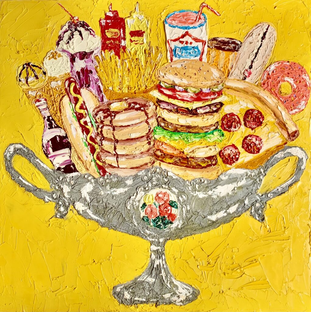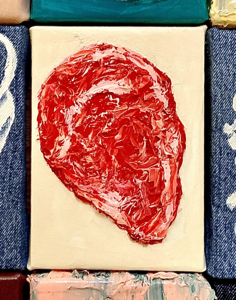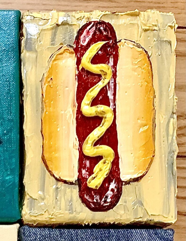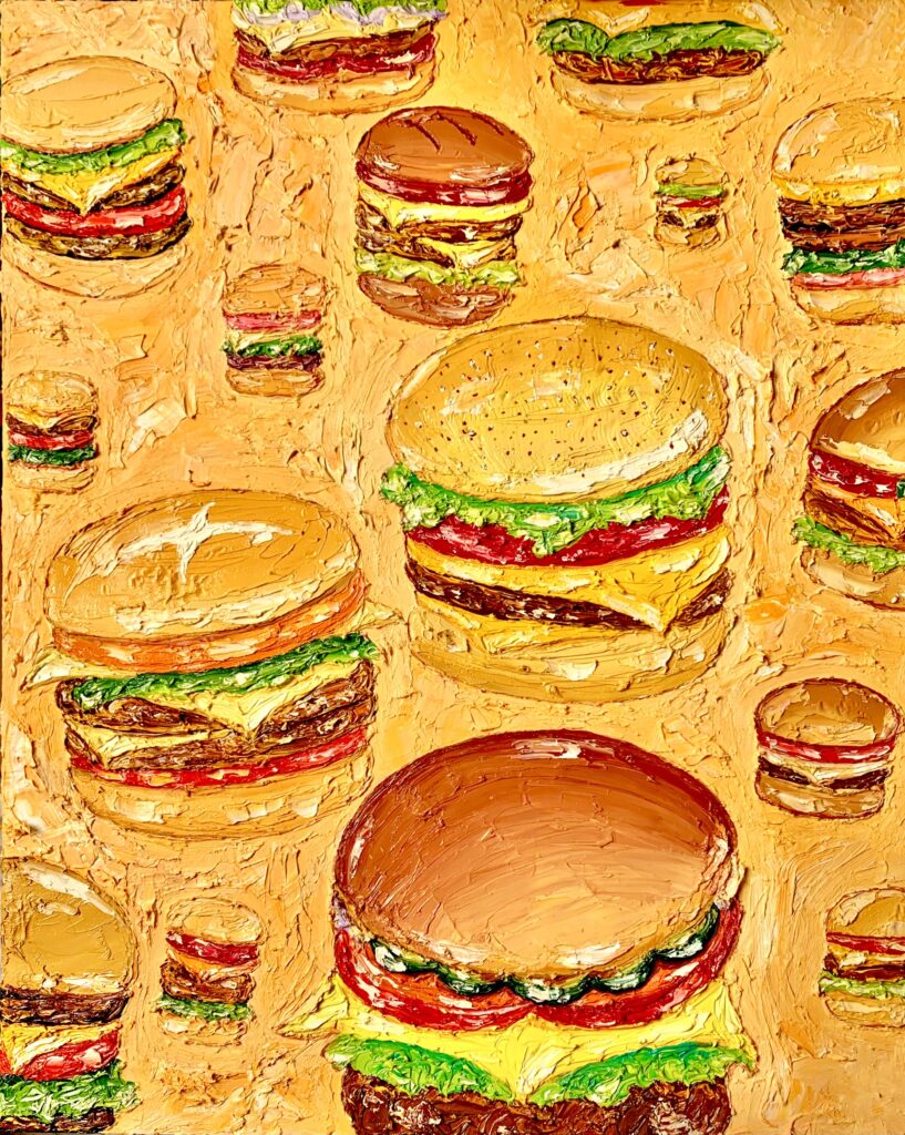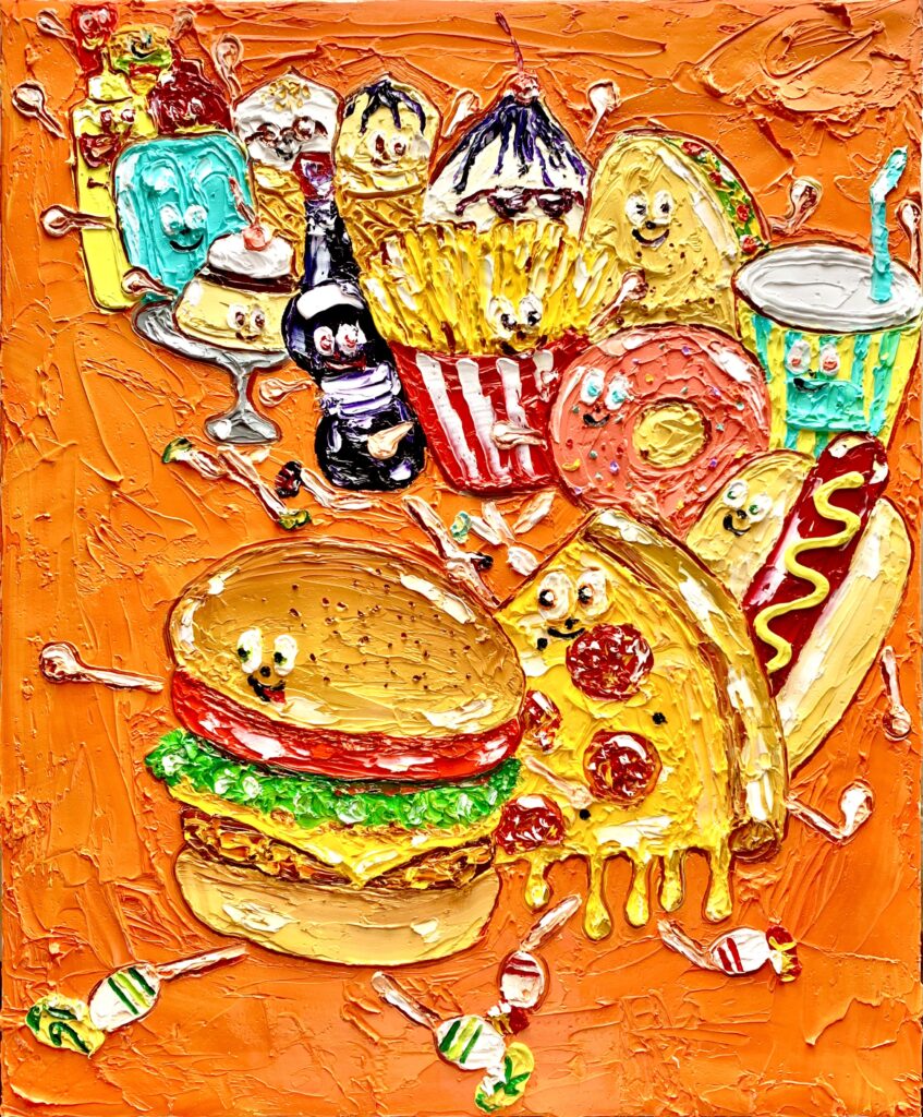 本展では、今年2月に初めて取り組んだ葉書サイズ(14.8×10.5×3cm)のキャンバス作品を中心に、新作約20点を展示いたします。油彩・アクリル絵の具・ペンなど多彩な画材を用い、ハンバーガー、ホットドッグ、デザート、プロレスラーといったモチーフを描いた小作品や、ミュージシャンを題材とした作品などをご紹介します。
