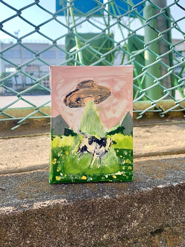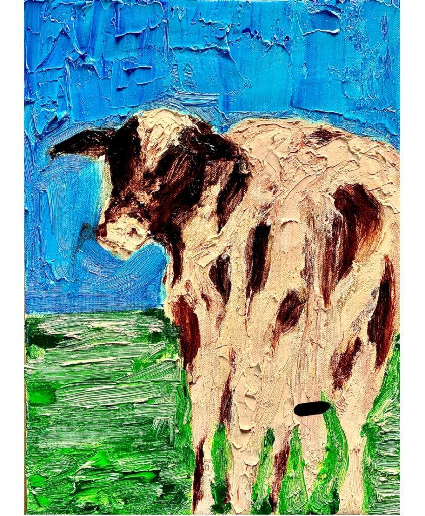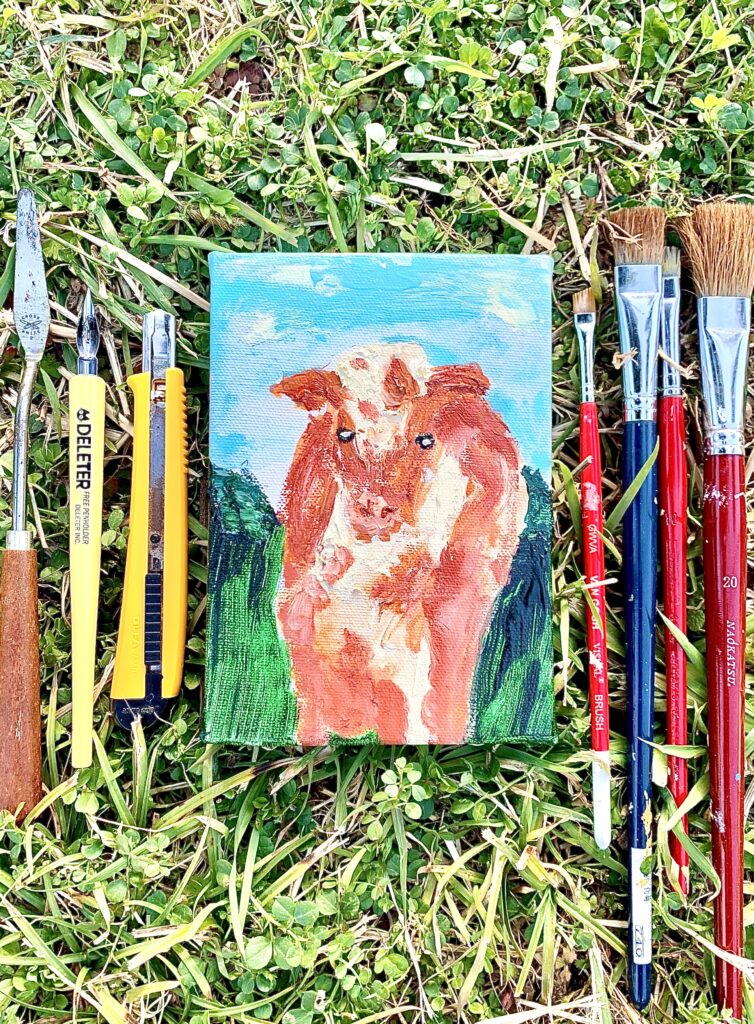 初の手に収まるぐらいのハガキサイズのキャンバスで油絵具とアクリルで牛を描きました。